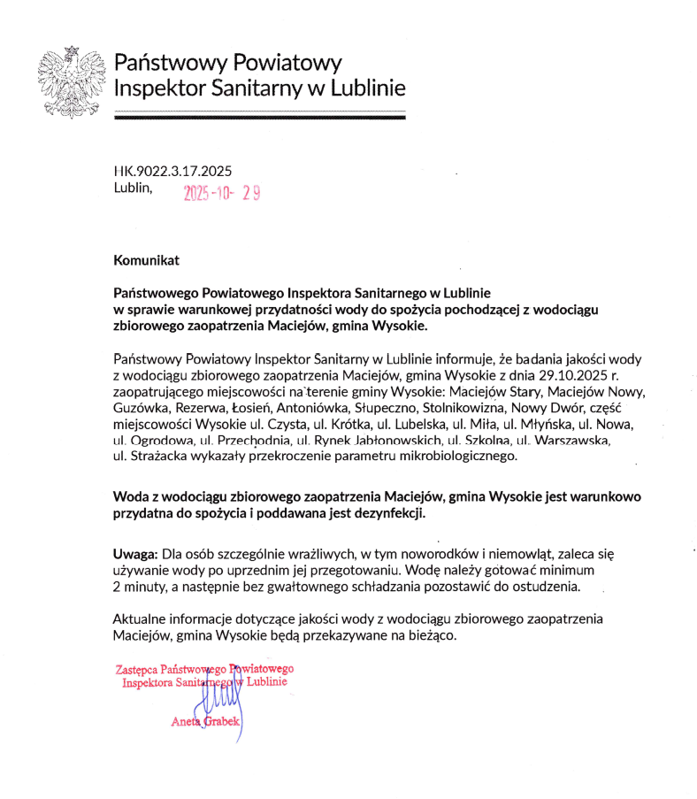 Komunikat w sprawie warunkowej przydatności wody do spożycia pochodzącej z wodociągu zbiorowego zaopatrzenia Maciejów, gmina Wysokie.